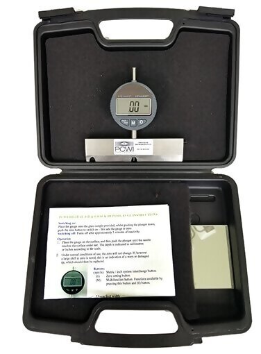The PCWI Pit & Crack Depth Gauge Kit includes gauge, carrying case, glass mirror sample, mini allen wrench, spare battery and instructions